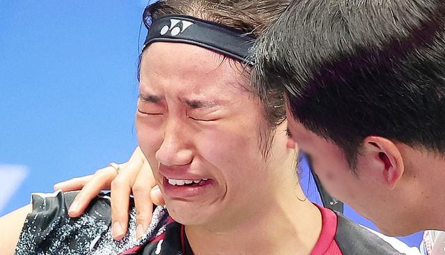 배드민턴 국가대표 안세영이 경기에서 승리한 뒤 눈물을 흘리고 있다. 기사 이해를 돕기 위한 자료 사진 / 연합뉴스