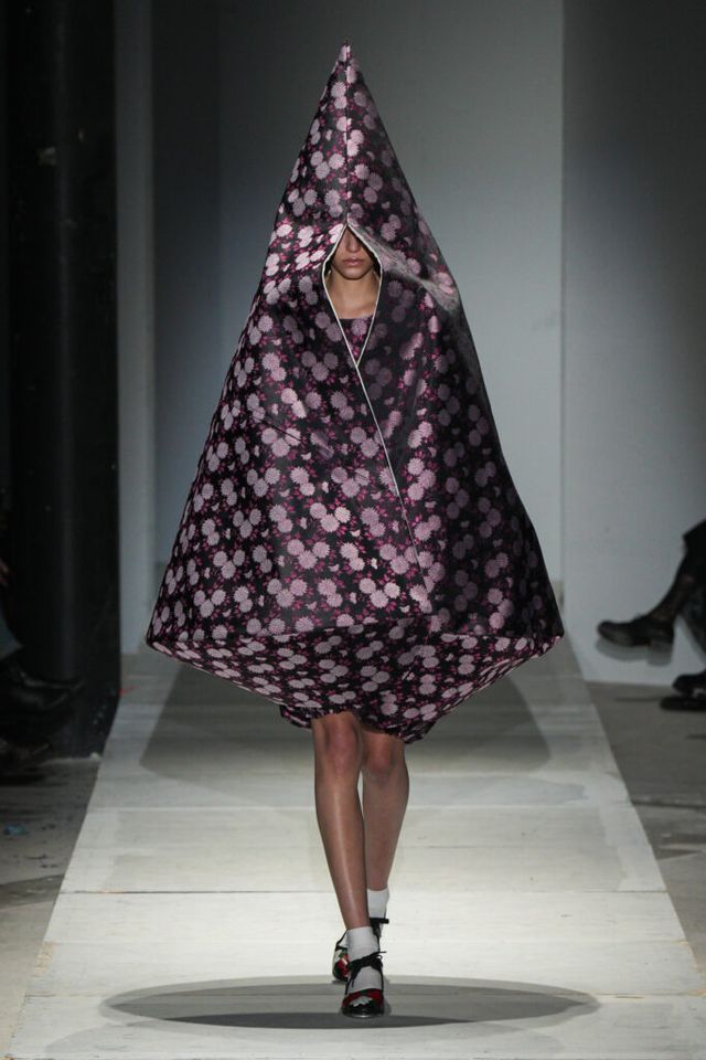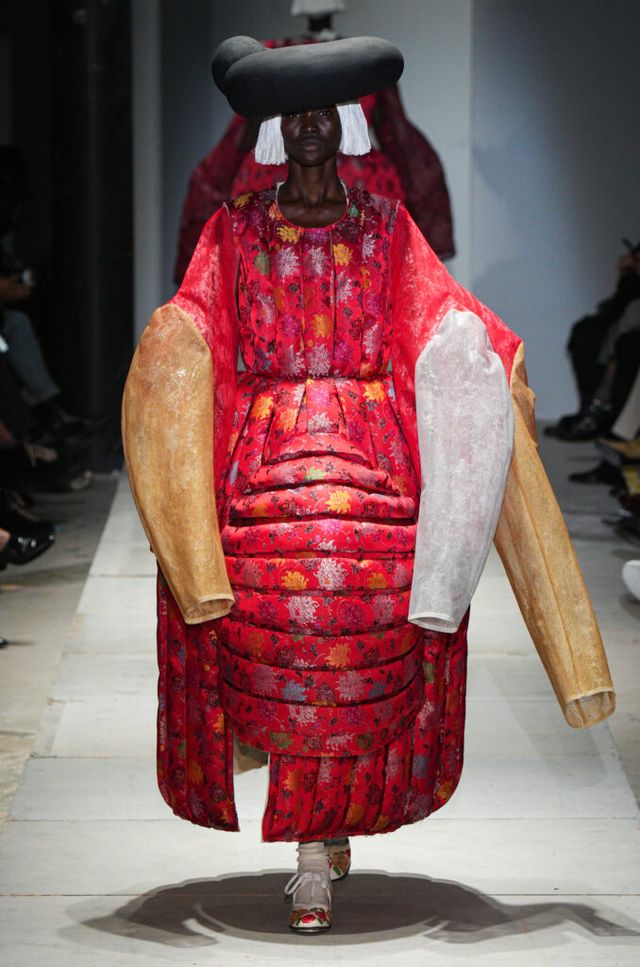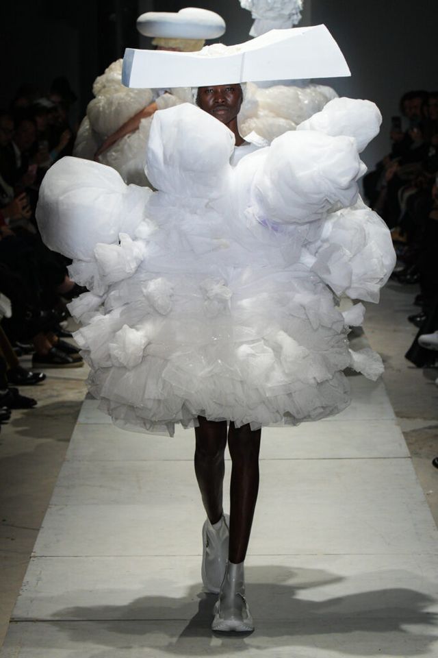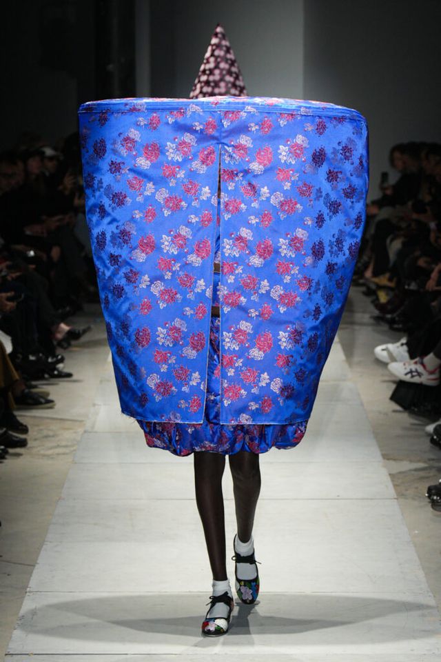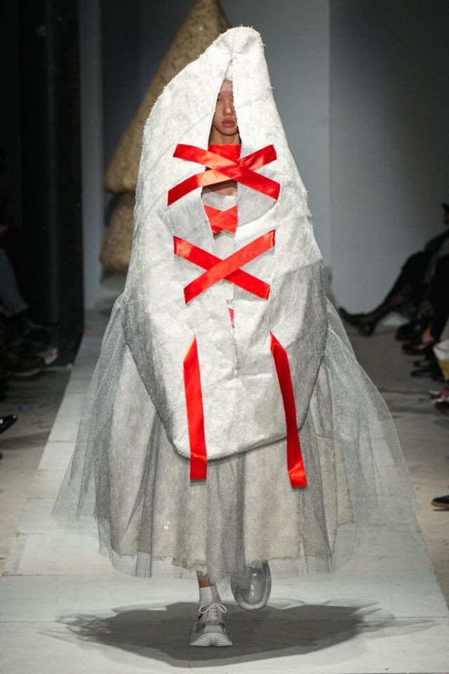 NOTE 하이패션의 성역과도 같은 런웨이마저 상업성에 잠식당한 요즘, 카와쿠보 레이가 선보이는 쿠튀르적 패션은 한때 우리가 좇던 ‘판타지로서의 패션’이 무언지 되돌아보게 만든다. 불확실성에 대해 이야기하고 싶었다는 짧은 전언을 제외하면 컬렉션에 관해 알려진 정보가 거의 없지만, 그렇기에 보이는 것 그대로 받아들일 수 있었던 쇼. 특히 인체라는 불변의 틀을 벗어나 주변 공간으로까지 영역을 확장한 점, 미래적 디자인과 상반되는 고전적 일본풍 소재를 섞어내며 환기를 시도한 점은 장르를 분명히 지키면서도 안주하지 않으려는 그의 성격을 엿볼 수 있는 대목이었다.