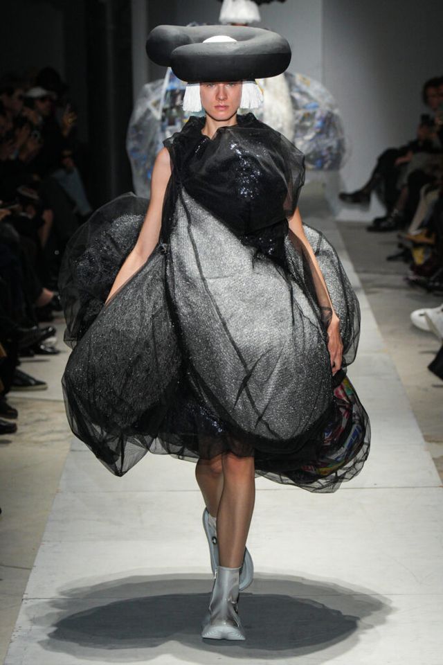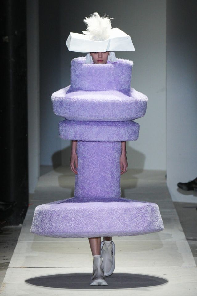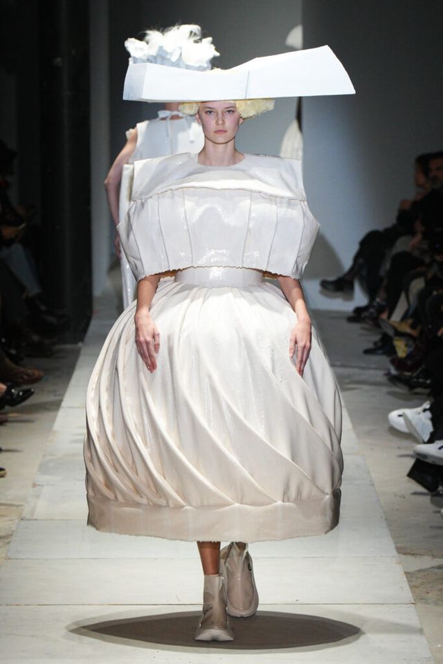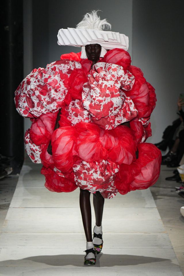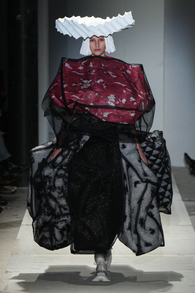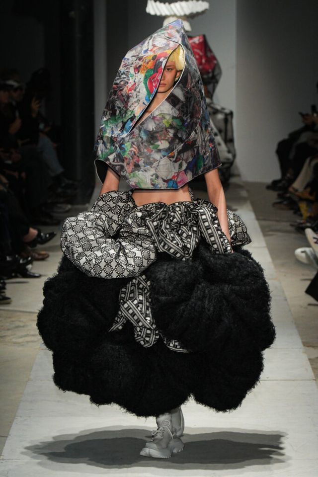 NOTE 하이패션의 성역과도 같은 런웨이마저 상업성에 잠식당한 요즘, 카와쿠보 레이가 선보이는 쿠튀르적 패션은 한때 우리가 좇던 ‘판타지로서의 패션’이 무언지 되돌아보게 만든다. 불확실성에 대해 이야기하고 싶었다는 짧은 전언을 제외하면 컬렉션에 관해 알려진 정보가 거의 없지만, 그렇기에 보이는 것 그대로 받아들일 수 있었던 쇼. 특히 인체라는 불변의 틀을 벗어나 주변 공간으로까지 영역을 확장한 점, 미래적 디자인과 상반되는 고전적 일본풍 소재를 섞어내며 환기를 시도한 점은 장르를 분명히 지키면서도 안주하지 않으려는 그의 성격을 엿볼 수 있는 대목이었다.
