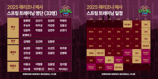 키움은 "오는 23일부터 3월 5일까지 42일 동안 미국 애리조나와 대만 가오슝에서 2025시즌 스프링캠프를 실시한다"라고 밝혔다. 홍원기 감독을 비롯해 코칭스태프 및 선수 총 42명이 참가한다.