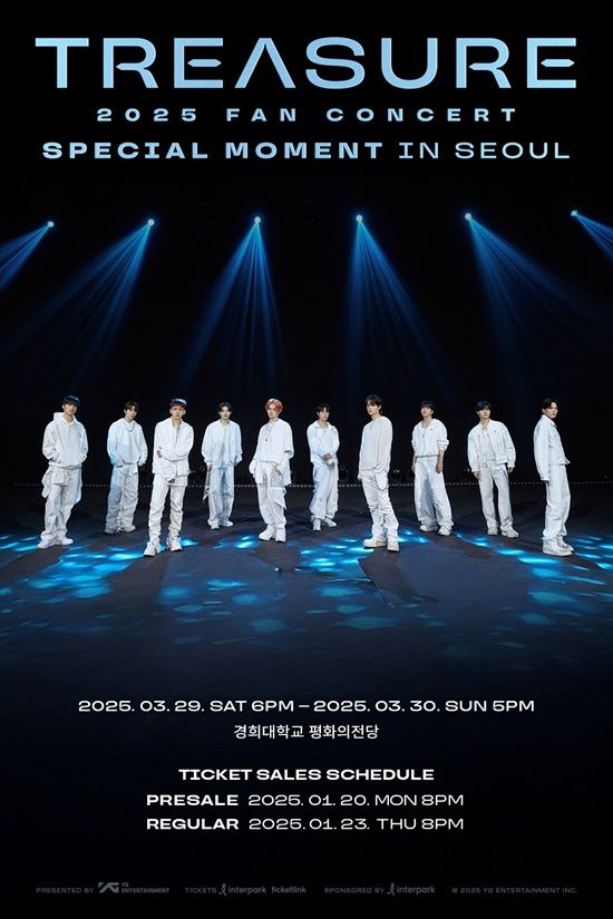 트레저는 오는 3월 29일과 30일 양일간 서울 동대문구 경희대학교 평화의 전당서 '2025 TREASURE FAN CONCERT -SPECIAL MOMENT- IN SEOUL'을 열고 총 9개 도시에 걸친 글로벌 팬 투어의 화려한 포문을 연다.