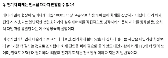 그래서 전기차 화재는 전소된 뒤 끄는 것이 일반적임.