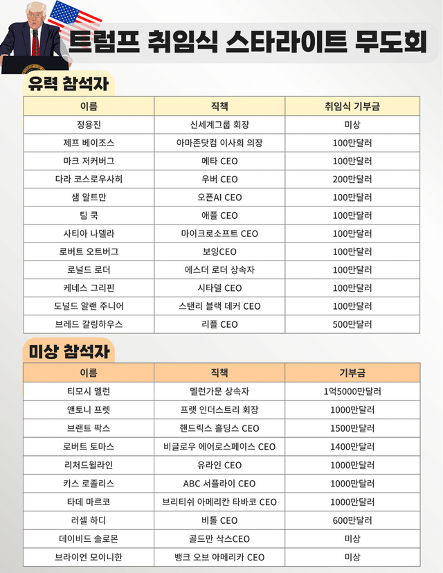 스타라이트 취임식에는 트럼프 대통령뿐만 아니라 미국 경제를 움직이는 재계 인물들이 대거 참석한다. 참석이 유력한 미국 재계 인물로는 △제프 베이조스 아마존닷컴 의장 △마크저커버그 메타 CEO △샘알트만 오픈AI CEO △팀 쿡 애플 CEO △로버트 오트버그 보잉 CEO △다라 코스로우사히 우버 CEO △사티아 나델라 마이크로소프트 CEO 등이 있다. 이들은 모두 취임식에만 100만달러(한화 약 14억5000만원) 이상을 기부한 인물들이다.