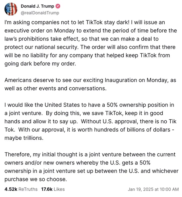 어제 틱톡이 대법원 판결에 따라 서비스가 일시적으로 중단되었지만, 트럼프는 자신의 취임 후 바로 행정명령을 통해 운영권 매각을 조건으로 이를 연기시킬 것이라고 말했습니다. 틱톡은 여기에 감사를 표하며 서비스를 다시 복구시키는 중입니다.