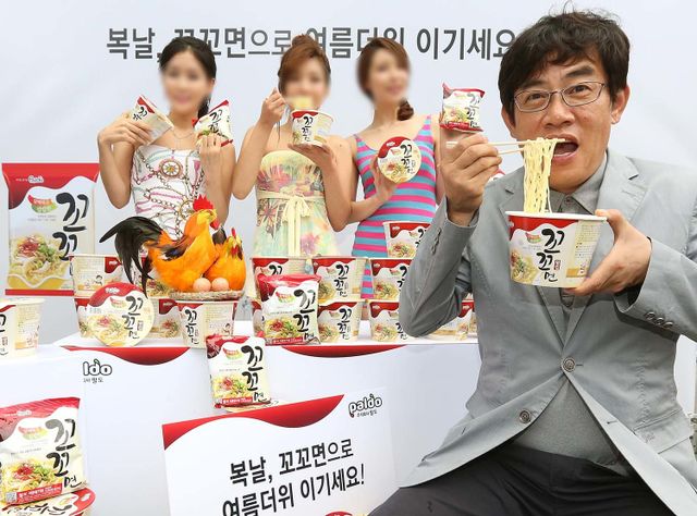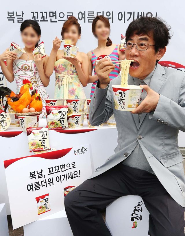 팔도가 2012년 7월 16일 오전 서울 청계광장 인근에서 복날을 앞두고 '복날 꼬꼬면으로 무더위 이기세요' 행사를 개최, 꼬꼬면 개발자인 이경규를 초청해 제품을 선보이고 있다. 오늘 행사에서는 청계광장을 찾은 시민들을 대상으로 꼬꼬면을 무료로 증정했다. / 뉴스1