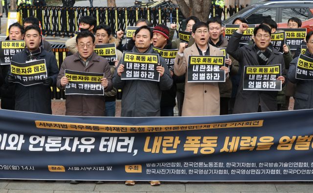 한국기자협회, 전국언론노동조합 등 언론단체들은 20일 서울 마포구 서부지법 앞에서 기자회견을 열고 "취재진을 향한 무차별적인 폭행은 전례가 없는 충격적인 행위"라며 폭도들의 강력 처벌을 주문했다.