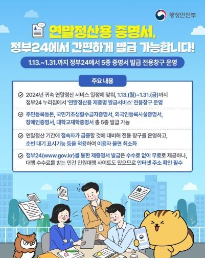 1.13.~1.31.까지 정부 24에서 5종 증명서 발급 전용창구 운영