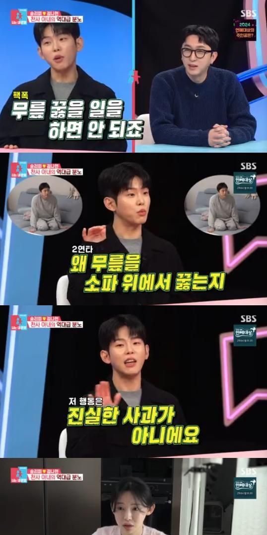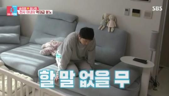 이날 슬리피 아내 김나현은 평소와는 달리 살벌한 눈빛으로 슬리피를 대했다. 슬리피 역시 김나현 앞에서 무릎을 꿇고 있어 모두를 깜짝 놀라게 했다. 김구라 역시 "나현 씨가 슬리피한테 이렇게 대할 사람이 아닌데..."라고 궁금해했다.