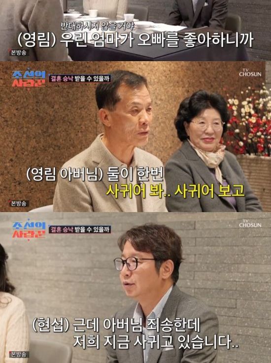 심현섭 여자친구 아버지는 "아까도 이야기했다. 딸내미가 워낙 좋아하니까 그게 승낙하는 것과 거의 진배없다. 내 생각은 그런데 집사람 생각은 틀릴 수가 있으니까"라며 승낙했고, 심현섭 여자친구 어머니는 "지금까지 잘 만났으니까 앞으로도 예쁘게 잘 만나서 잘 살았으면 좋겠다"라며 덧붙였다.