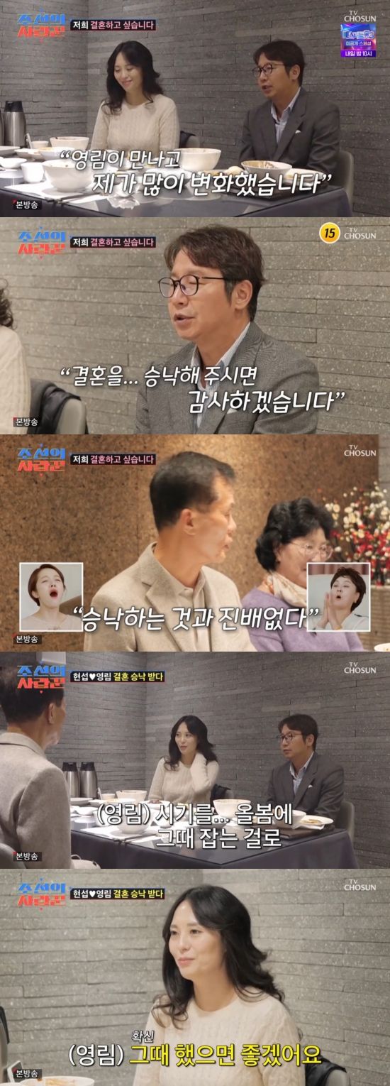 심현섭은 "오늘 영림이한테 아버님, 어머님 뵙고 드릴 말씀이 있다. 저번에 뵀을 때 아버님이 '뭐 이렇게 급하냐. 더 만나봐라' 그래가지고 그러신 지가 몇 개월이 흘렀다. 영림이 하고 미래에 좀 평생 짝이 되어서 제가 한 남자로서 가장으로서 남편이 된다면 남편으로서 행복하게 재밌게 잘 살 수 있도록 결혼을 승낙해 주시면 감사하겠다"라며 전했다.