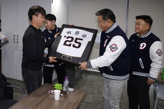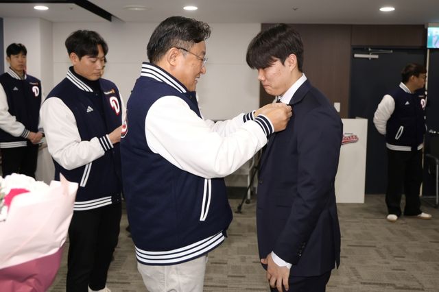 고영섭 두산 베어스 사장은 구단이 제공한 선수단 맞춤 정장에 그룹 배지를 직접 달아주며 '두산인'이 된 신인들을 환영했다. 아울러 고 사장은 선수단의 이름과 입단년도가 새겨진 유니폼 액자를 가족들에게 선물했다.
