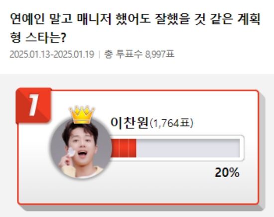 커뮤니티 포털사이트 디시인사이드(대표 김유식)는 지난 13일부터 19일까지 7일간 진행한 "연예인 말고 매니저 했어도 잘했을 것 같은 계획형 스타는?" 투표에서 이찬원이 1위를 차지했다고 밝혔다.