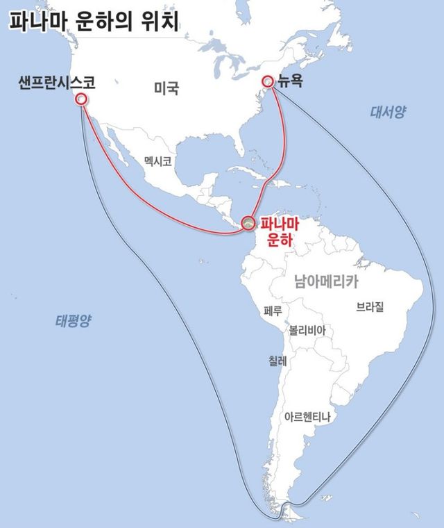 파나마 운하 위치는 여기임 저기 안거치면 돌아서 가야함