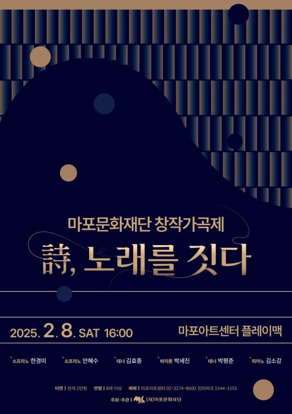마포문화재단이 자체 제작한 창작가곡 및 가곡을 무대에 올린다. 오는 2월 8일 마포마트센터 플레이맥에서 열리는 2025 마포문화재단 창작가곡제 ‘詩(시), 노래를 짓다’를 통해서다.