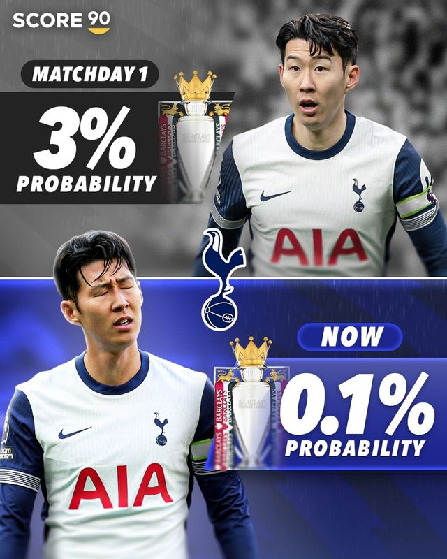 토트넘이 이번 시즌 프리미어리그를 우승할 확률은 0.1% 이하다. 반대로 강등 가능성이 더 현실적인 상황이다. 축구팬들은 토트넘이 이 부진에서 탈출할 수 있을지 끝까지 관심있게 지켜볼 것이다.