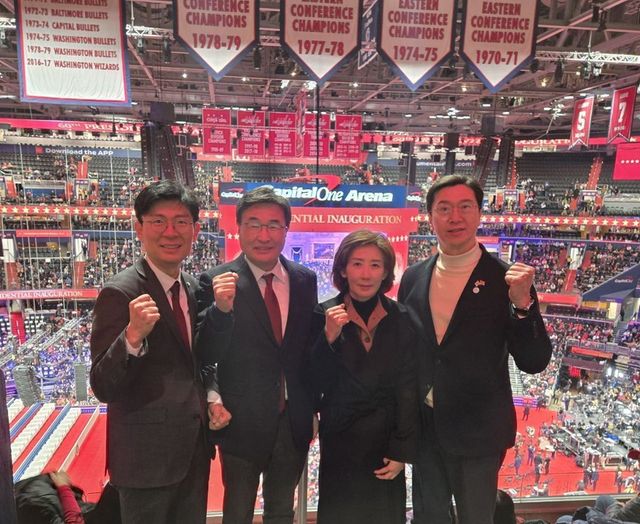 조정훈, 김대식, 나경원, 강민국(왼쪽부터) 국민의힘 의원이 20일(현지 시각) 미국 워싱턴DC 캐피털 원 아레나에서 열린 도널드 트럼프 대통령 취임식에 참석해 기념 촬영하고 있다. / 조정훈 의원실·뉴스1