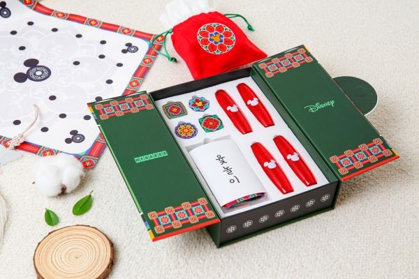 이번 상품은 메가박스가 설날 연휴를 맞아 전통 놀이문화 윷놀이에 디즈니의 ‘미키 마우스’ 디자인을 적용한 것이다. 윷가락, 윷판, 말(馬) 등 곳곳에서 한국 전통 단청 무늬와 ‘미키 마우스’ 이미지가 어우러진 디자인이다.