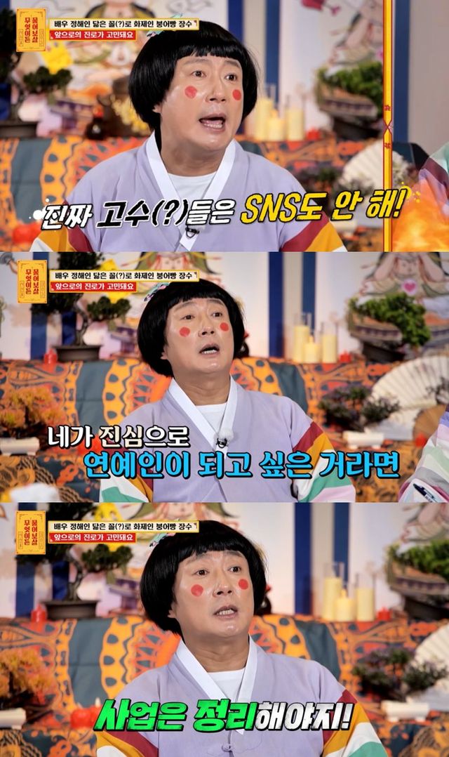 이에 이경규는 방송을 하겠다고 마음을 먹었을 때 "어떻게 될지 생각 안하고 들어왔다"며 그 결과 현재도 건재하다며 "목숨을 걸든지 때려치우든지" 하나만 하라고 말했다. 이수근은 "이쪽 일은 쉽지 않다"며 "너가 정해인은 아니잖아"라고 덧붙였다.