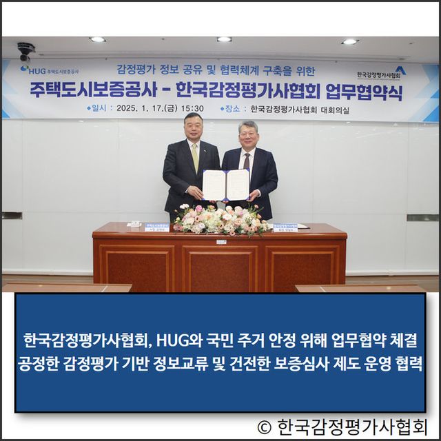 업무협약은 공정한 감정평가 기반 정보교류와 건전한 보증심사 제도 운영을 위한 협력체계를 구축함으로써 국민 주거복지 향상에 이바지하기 위해 마련됐다.
