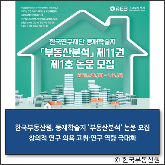 김근용 한국부동산원 연구원장은 "등재학술지 '부동산분석' 논문 모집을 통해 연구자의 창의적 연구 의욕을 고취시키고 연구 역량을 극대화할 수 있는 통로를 마련하겠다"고 말했다.