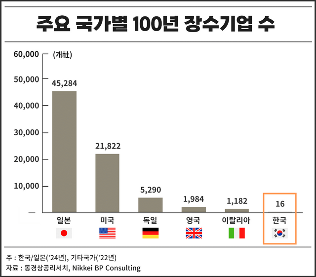 최근 경영환경의 급속한 변화로 기업의 수명이 줄어들고 있지만 전 세계에서 100년 이상된 장수기업의 수는 무려 8만개가 넘는다. 그중 가장 많은 장수기업을 보유한 나라는 단연 일본이다. 닛케이BP 컨설팅 등에 따르면 2024년 기준 일본은 4만5284개의 100년 기업을 보유하고 있으며, 미국은 2만1822개, 독일은 5290개를 기록하고 있다.