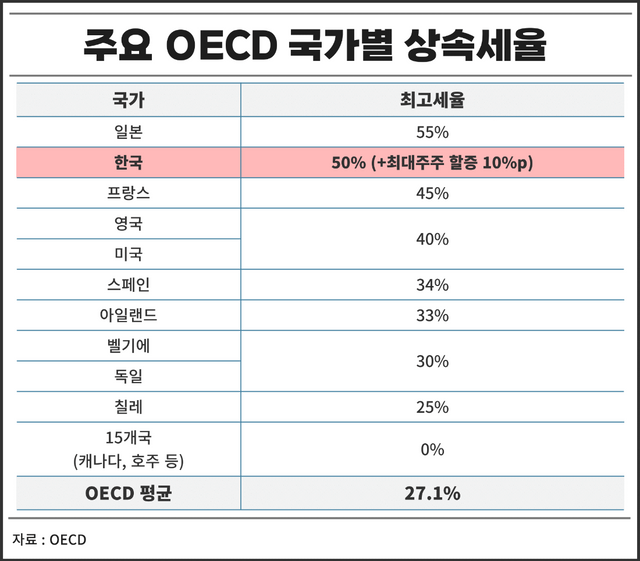 가장 큰 문제는 상속세와 가업승계의 어려움이 지목된다. 한국의 상속세율은 최고 50%에 달하며, 최대주주 할증평가를 적용할 경우 60%에 이른다. 이는 OECD 국가 중에서도 최고 수준이다. 이로 인해 많은 기업이 상속 과정에서 자산을 유지하지 못하고 매각되거나 사라지는 사례가 빈번했다.