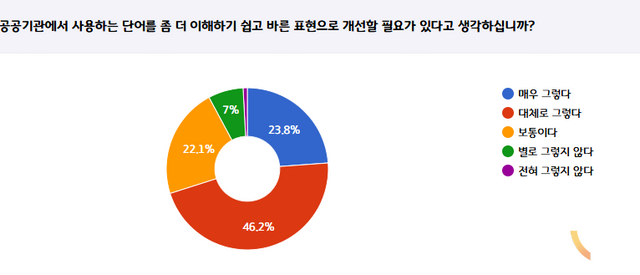 대체어 선정에 앞서 한국어문화원은 경기도 여론조사 누리집(홈페이지)을 통해 대국민 인식 조사를 실시했다. 총 5468명이 참여한 조사에서는 응답자 중 70%가 ‘공공기관에서 사용하는 단어를 개선할 필요가 있다’고 답하며, 공공언어 개선의 필요성을 확인했다.