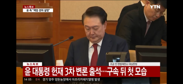 윤 대통령은 1분 남짓의 해당 발언 뒤 심판 진행 1시간 여가 지난 현재까지 입술을 다문 채 큰 표정 변화 없이 자리를 지키고 있다. 그는 옆자리 변호인이 발언 순서에, 몸을 변호인 측으로 기울이며 마이크를 가까이 하라는 손짓을 하기도 했다.