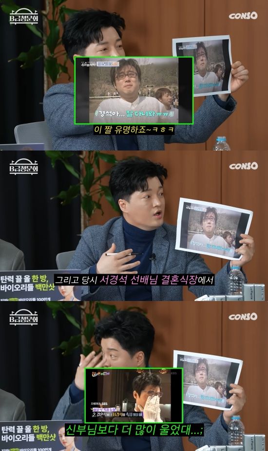 이날 이윤석은 과거 서경석이 훈련소에 입소할 당시 우정반지를 맞추고 오열했던 일과 서경석의 결혼식 당시에도 눈물을 보인것과 관련해 "반지는 솔직히 방송의 재미도 생각을 해서 준비를 한 것"이라고 운을 뗐다.