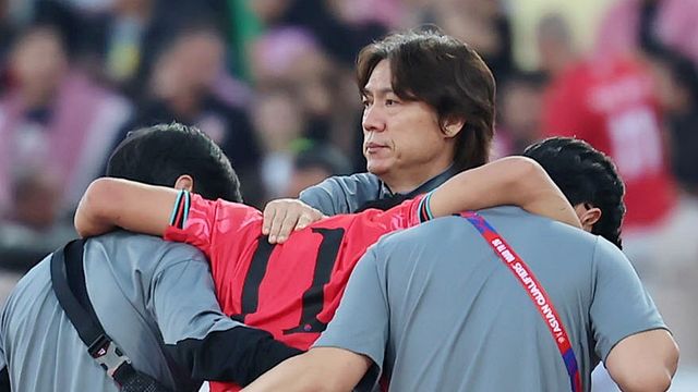부상으로 교체되는 황희찬 다독이는 한국 축구대표팀 홍명보 감독 / 뉴스1