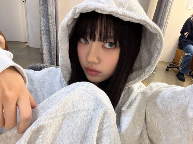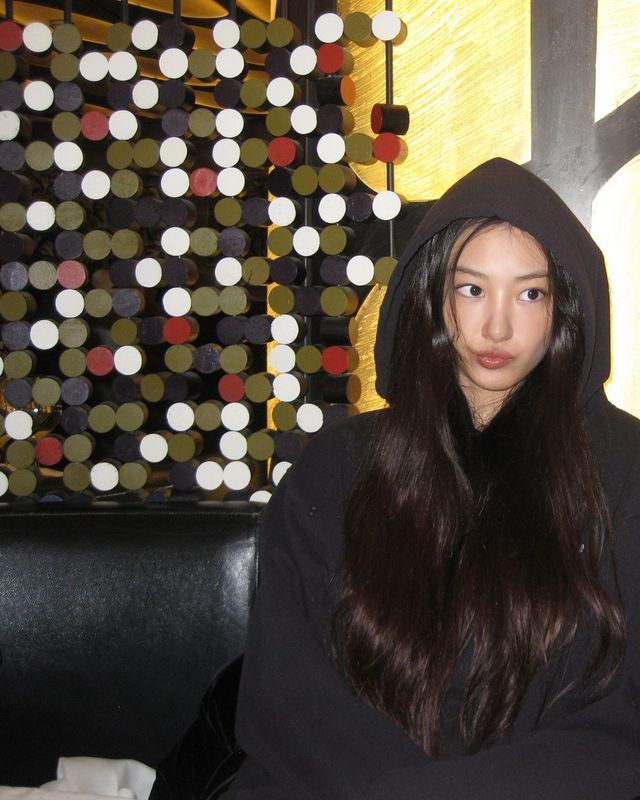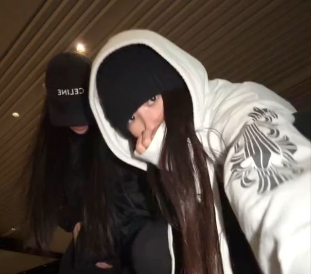가원은 블랙 비니 위에 화이트 후드를 겹쳐 캐주얼한 매력을 뽐냈어요. 풀뱅 앞머리를 한 수인이 후드를 쓰니 얼굴이 두 배로 작아 보이는군요.