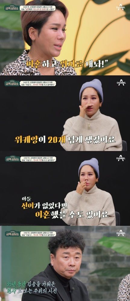 김송은 "참느라 위궤양이 20개 넘게 생겼다. 죽는 줄 알았다"며 아들이 없었으면 이혼했을 수도 있다고 덧붙여 안타까움을 자아냈다.