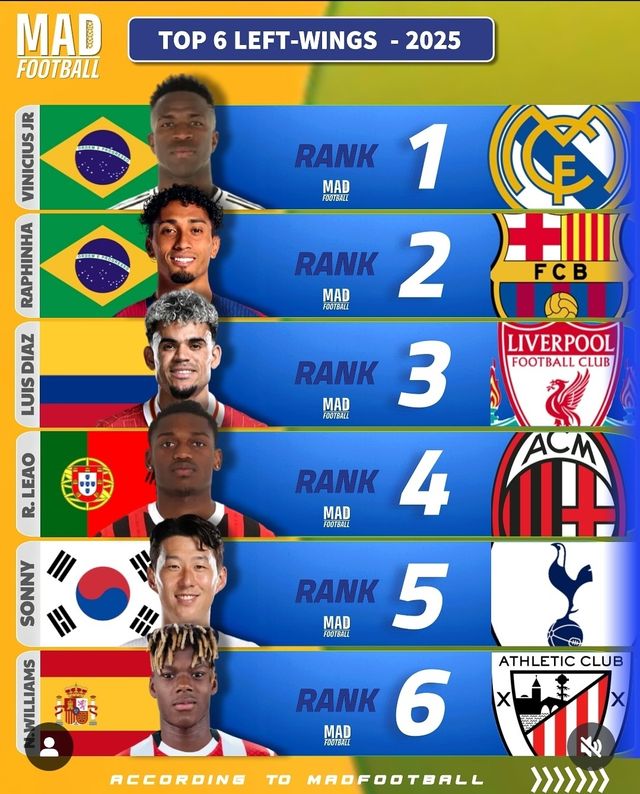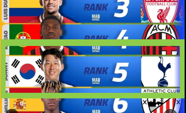 축구 콘텐츠 매체 '매드 풋볼'은 새해 들어 각 포지션별 전세계 순위를 매기고 있는데 손흥민은 비니시우스(레알 마드리드)~하피냐(바르셀로나)~루이스 디아스(리버풀)~하파엘 레앙(AC밀란)에 이어 전세계 5위를 차지했다. 손흥민 이름 옆에 태극기가 펄럭였다.