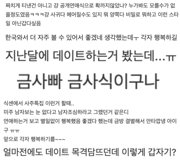 일부는 “공개 연애가 부담스러웠을 것”이라며 두 사람의 결정을 존중하는 반응을 보였고, 다른 일부는 “연애와 결별 모두 자연스러운 일”이라는 의견을 내비쳤다.
