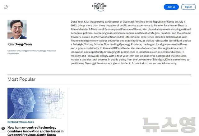 한편, 다보스포럼은 특별세션을 통해 김 지사에 대한 소개 페이지를 만들어 제공하고 있다. 다보스포럼은 “김동연 지사는 30년 이상의 공직 경험을 바탕으로 경기도를 이끌고 있다. 대한민국 경제부총리 겸 기획재정부 장관을 역임했으며 국가 경제 정책 수립에 핵심적인 역할을 수행했고, 거시·미시경제, 재정 전략, 조세, 국가 재정 및 국제 금융 등을 총괄했다. 대한민국 GDP와 무역에서 중요한 역할을 하는 최대 지방정부인 경기도를 이끌며, 반도체, IT, 모빌리티, 재생에너지와 같은 첨단산업에서의 경기도의 입지를 활용해 이 지역을 혁신과 기회의 중심지로 탈바꿈시키고자 한다”고 소개했다.