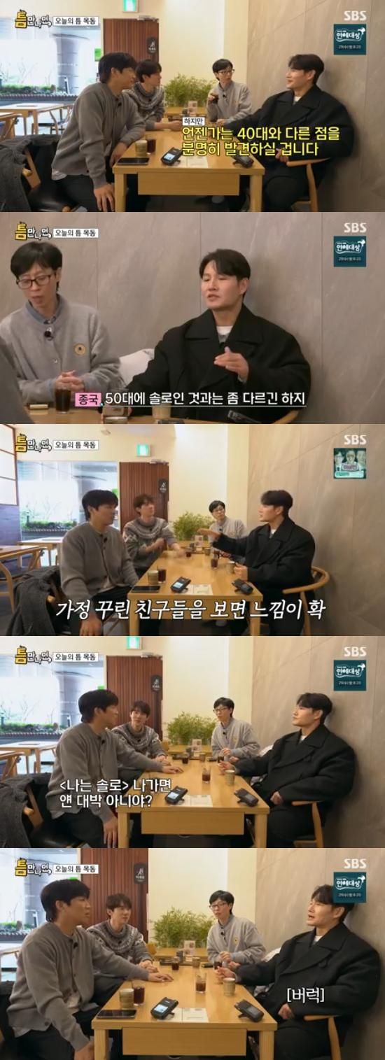 그러면서 김종국은 "친구들이 전부 가정이 있으면 혼자 세월만 가는 느낌"이라고 했고, 이를 들은 차태현은 "꼭 (상대가) 초혼일 필요는 없는 거 아니냐. '나는 솔로' 나가면 대박 아냐?"라고 말했다. 이에 김종국은 "알아서 할게"라고 짜증을 내 웃음을 자아냈다.