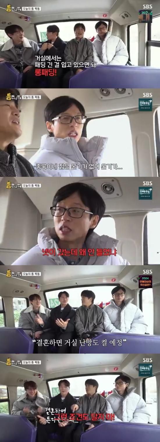 그러면서 김종국은 "그런데 결혼을 하면 당연히 난방을 할거다. 지금은 혼자니까 할 필요가 없는 것"이라고 했고, 이에 차태현은 "그런 말 그만해. 결혼 하면 켠다는 그런 말도 하지마. 너 진짜 결혼 못 해"라고 말해 웃음을 자아냈다.