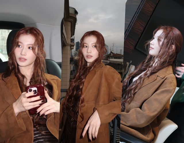 이날 사나는 브라운 컬러의 롱 재킷과 레더 소재의 미니 원피스를 입고 고혹적인 분위기를 완성해 눈길을 끌었다. 특히 짧은 기장의 원피스에 사나는 탄탄한 허벅지와 늘씬한 각선미를 고스란히 드러내며 아찔한 매력을 더했다.