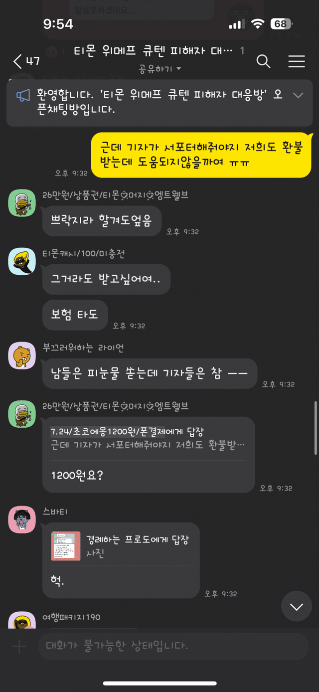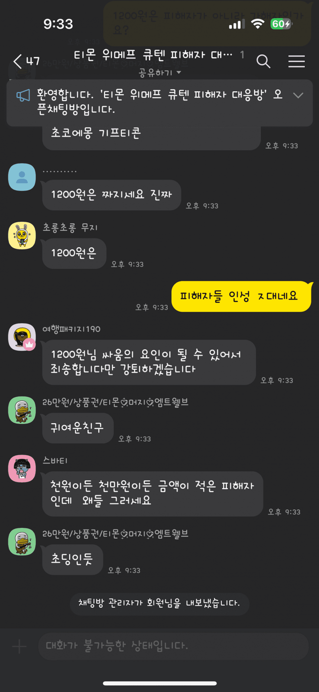 티몬) 1,200원 물린 회원, 피해자 단톡방에서 강퇴