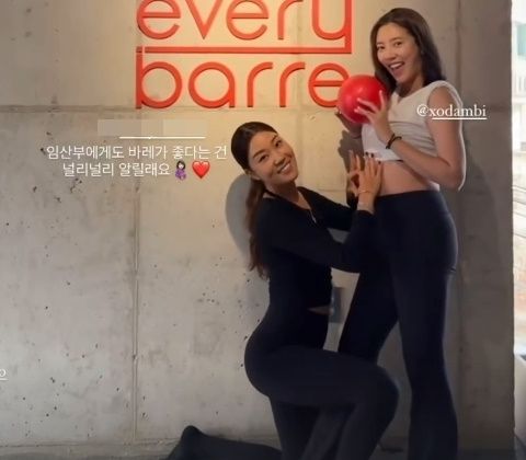 손담비는 22일 자신의 SNS에 바레 트레이너와 함께 포즈를 취하고 카메라를 응시하고 있는 모습이 담긴 짧은 영상을 게재했다. 트레이너는 손담비의 배에 하트를 그려 보이며 뱃속 아가에 대한 애정을 보여주고 있다. 임신 7개월차인 손담비의 살짝 나온 배가 인상적이다.