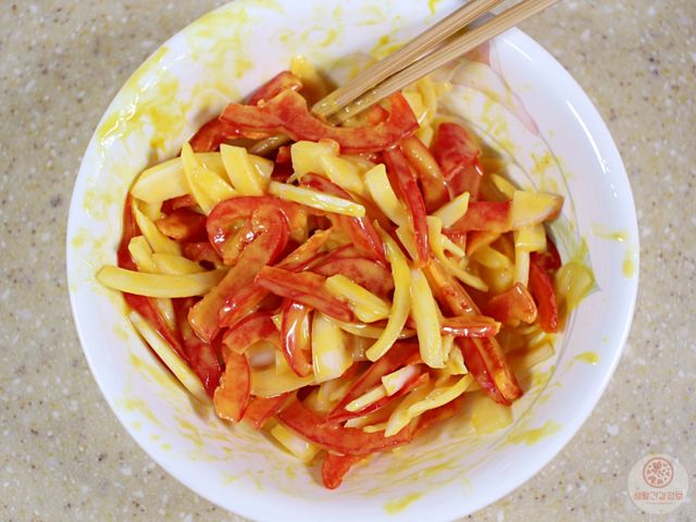 야채를 깨끗하게 씻어서 머스타드소스 넣고 버무렸어요.