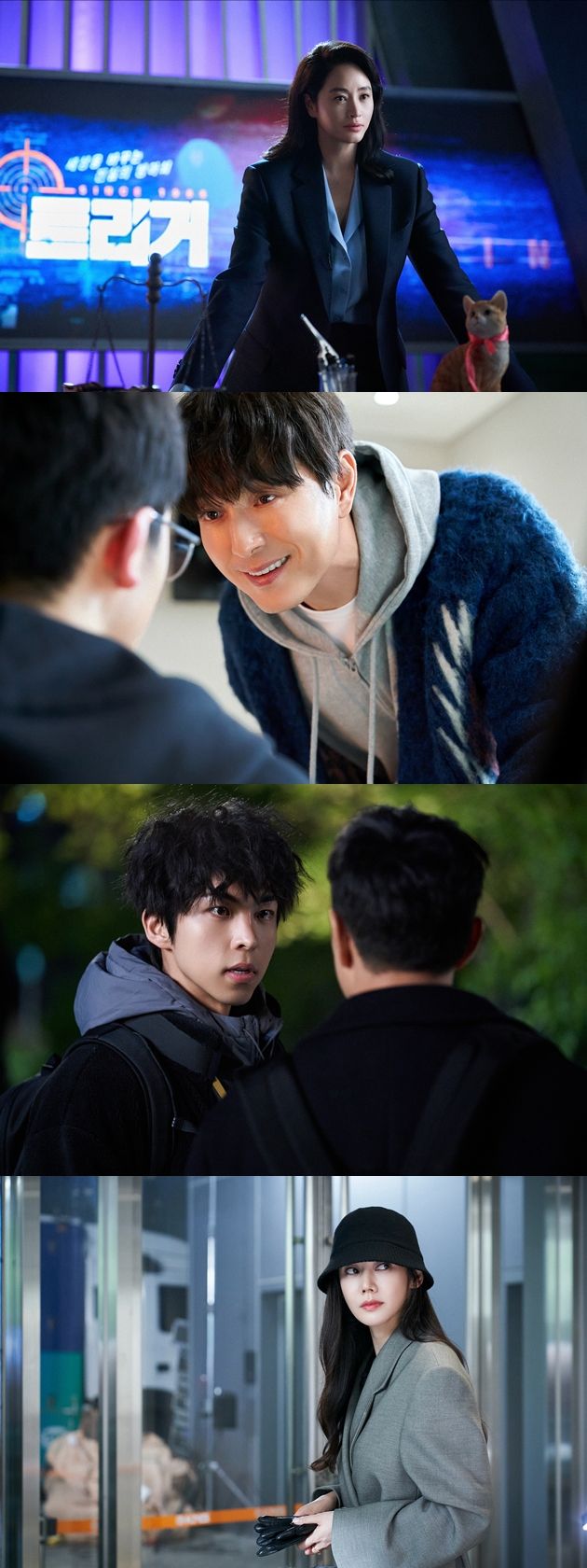 이에 공개된 3~4회 스틸에는 사건을 둘러싼 트리거 팀의 다채로운 모습들이 담겨 시선을 사로잡는다. 고양이 도시 괴담 사건의 진실을 밝히는 날카로운 카리스마의 MC 오소룡(김혜수 분)의 모습부터 사건 현장을 취재하기 위해 카메라를 들이대는 한도(정성일)와 강기호(주종혁)의 모습은 진실을 밝혀내기 위한 트리거 팀의 무궁무진한 활약상을 기대케 한다.