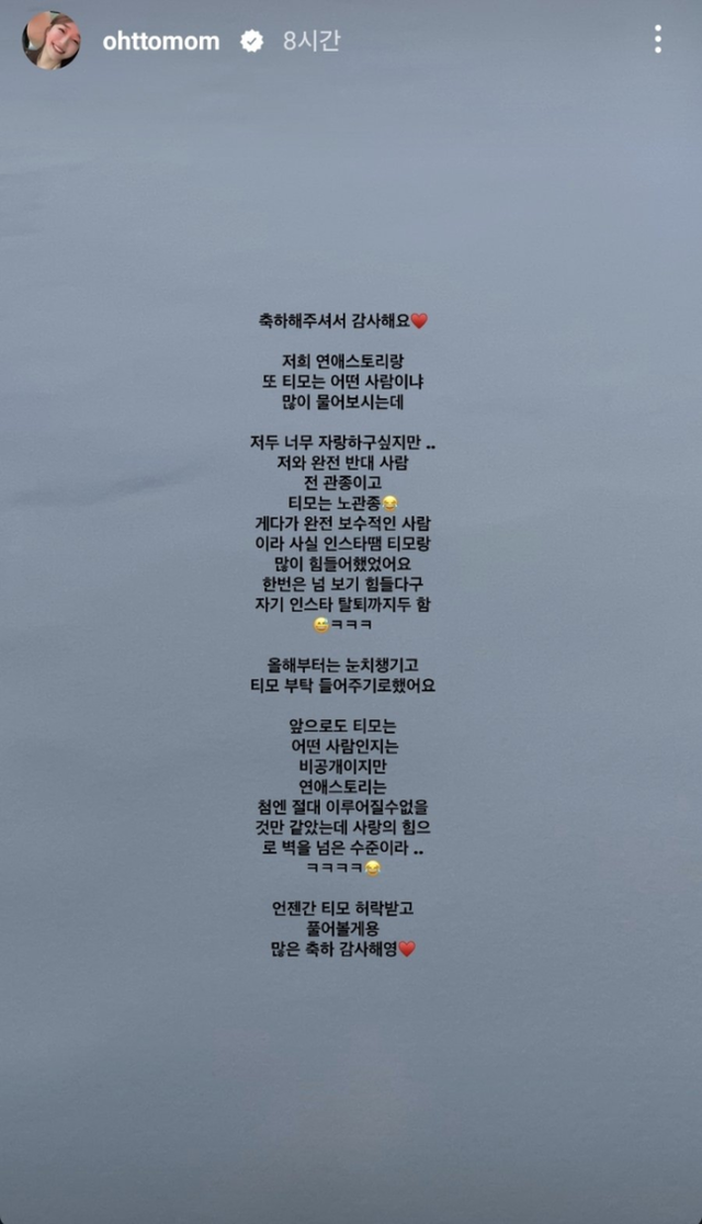 오또맘은 지난 21일 자신의 SNS에 “축하해주셔서 감사하다. 티모를 자랑하고 싶지만 저와 완전 반대 사람”이라면서 “앞으로도 티모는 어떤 사람인지는 비공개지만 연애 스토리는 처음에 절대 이루어질 수 없을 것만 같았는데 사랑의 힘으로 벽을 넘은 수준”이라며 열애 중임을 밝혔다.