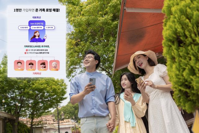 가족로밍은 로밍 상품 '바로 요금제'에 가입한 가족 대표 1명이 3000원만 추가하면 모든 가족(대표 포함 최대 5명)이 로밍 데이터를 함께 사용할 수 있는 서비스다. 음성통화와 문자도 무료다.