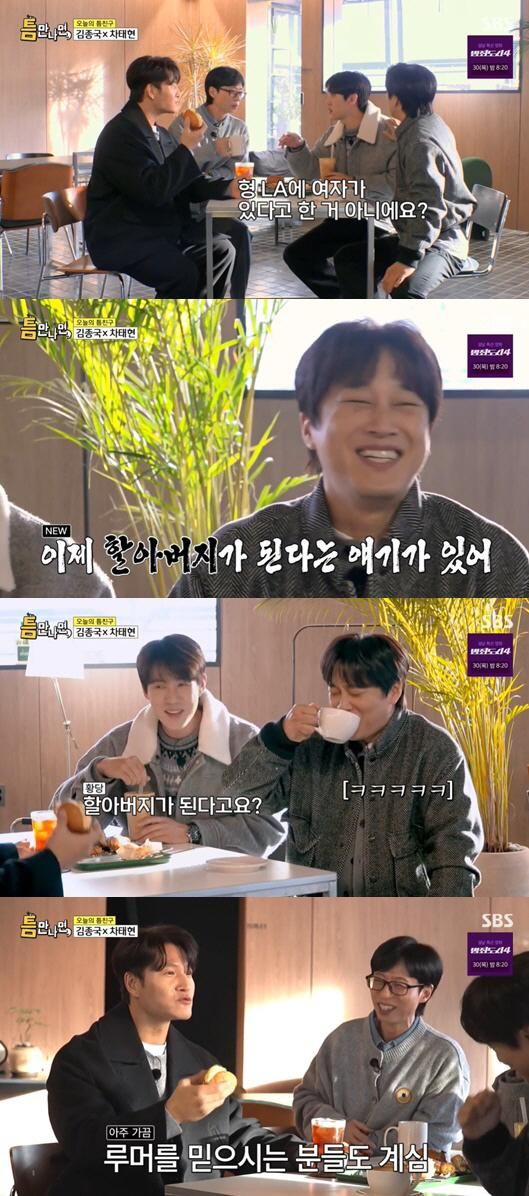 특히 김종국을 둘러싼 결혼 루머가 화두에 올랐다. 차태현은 김종국이 LA에 여자친구와 아이가 있다는 소문을 언급하며 "김종국이 2025년에 할아버지가 된다"라고 농담을 던져 스튜디오를 웃음바다로 만들었다.