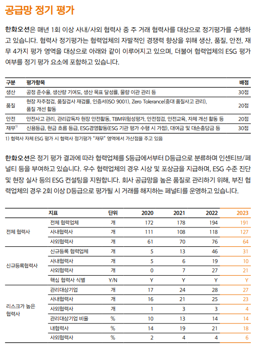한화오션이 이렇게 세부적으로 배점까지 하여 점수를 매기는 일을 시간이 남아서 하는 건 아닐 것이다. 2023년의 경우 191개의 협력사(사내 127개, 사외 64개)를 평가해 점수가 제일 높은 그룹에는 S 등급을, 점수가 가장 낮은 그룹에는 D 등급을 매긴다. 이미 '리스크가 높은 협력사'로 2022년에 28개, 2023년에 27개가 평가된 것으로 나온다.