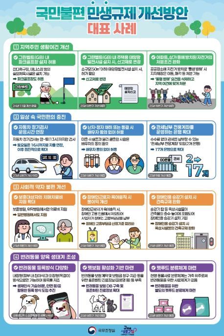 그간 정부는 경제활력 제고를 위한 킬러규제 혁파와 더불어 국민불편 해소를 위한 민생규제 개선을 적극 추진해왔다. 이번 방안은 지역 주민의 생활 여건 개선과 일상 속 국민편의 증진 등 민생현장의 불편‧부담을 신속하게 해결하기 위해 마련됐다.