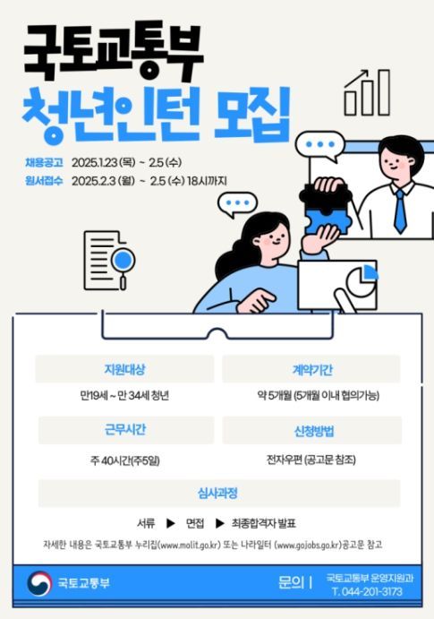 [와이뉴스] 국토교통부는 청년에게 공공부문의 일경험을 제공하고 국토교통 분야 정책 수립 및 집행 과정에 청년의 다양하고 참신한 생각들을 반영하기 위하여 1월 23일부터 2월 5일까지 청년인턴을 모집한다.