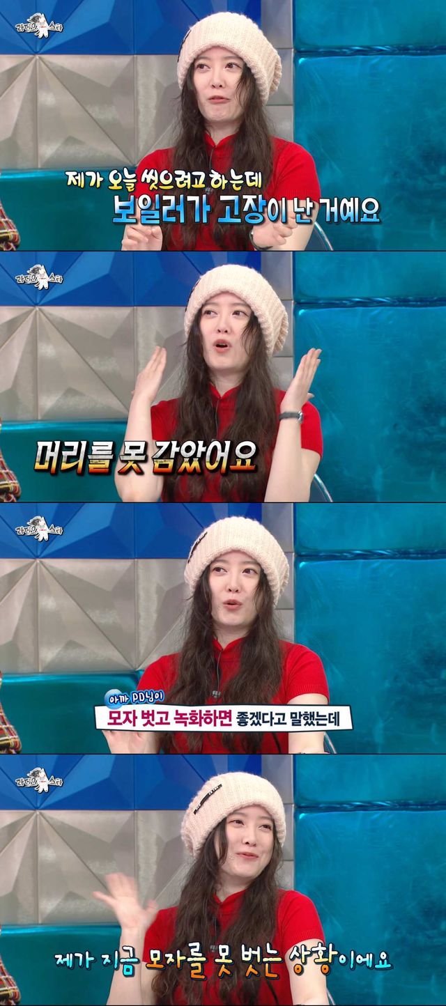 구혜선은 지난 15일 방송된 '라디오스타'에 출연해 "보일러가 고장 나서 머리를 못 감았다. 그래서 모자를 썼다"며 "PD님이 모자 벗고 촬영하면 좋겠다고 했는데, 지금 모자를 못 벗는 상황이다"라고 말했다.