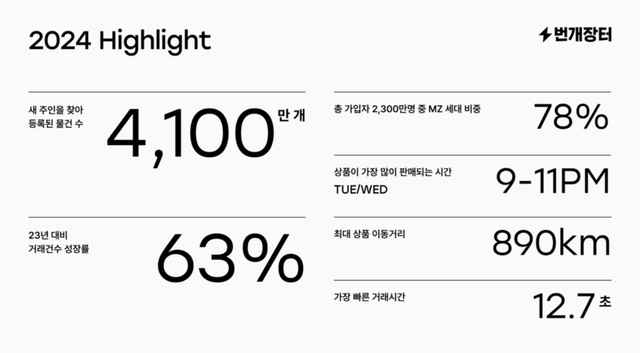 리포트에 따르면, 2024년 번개장터의 거래 건수는 전년 대비 63% 증가했고, 총 상품 등록 건수는 4100만 개를 넘어섰다.